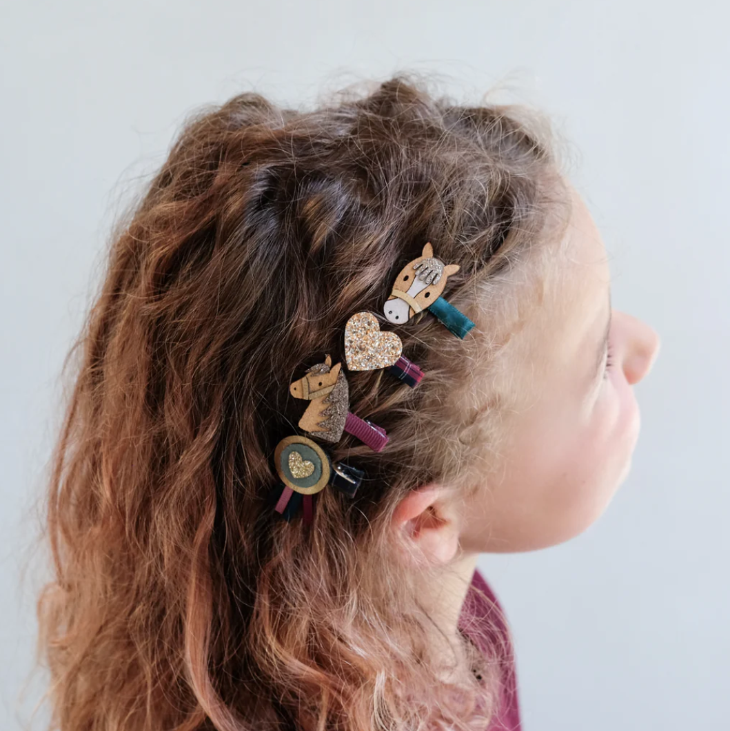 Ponies, rosettes and hearts crafted from a mix of suedette, glitter and metallic fabrics with grosgrain ribbon tails