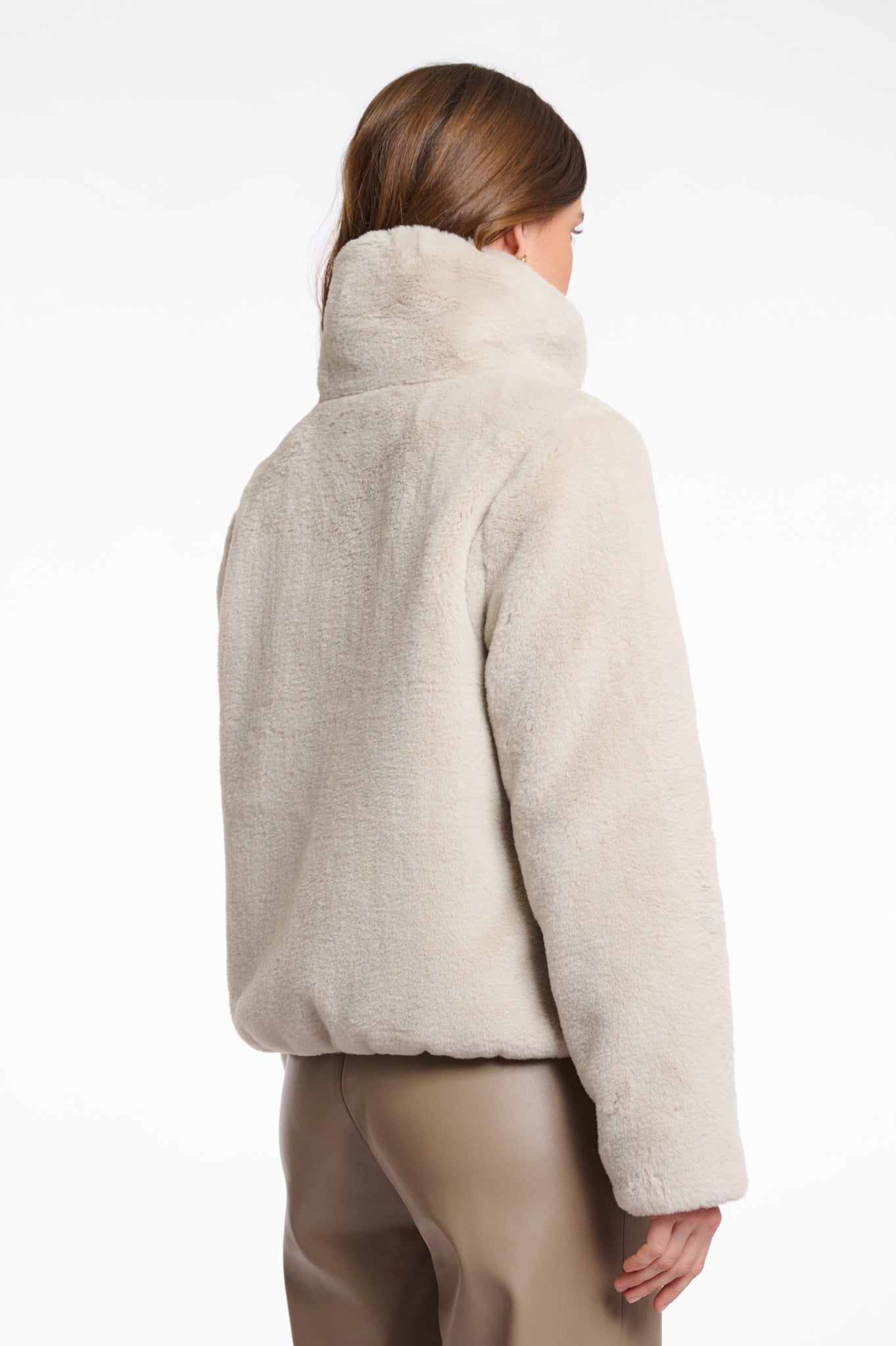 This is a short, loose-fitting jacket, with a high neck collar, a zipper closure in the front and side pockets and it has lining inside the pockets.